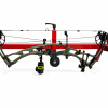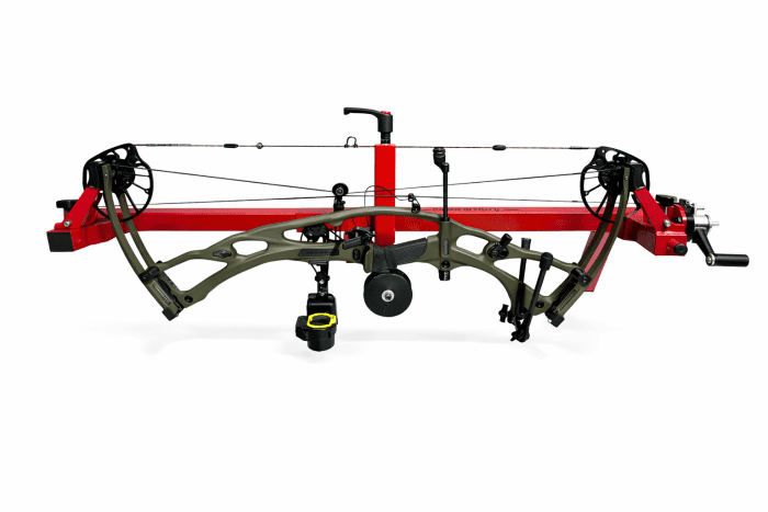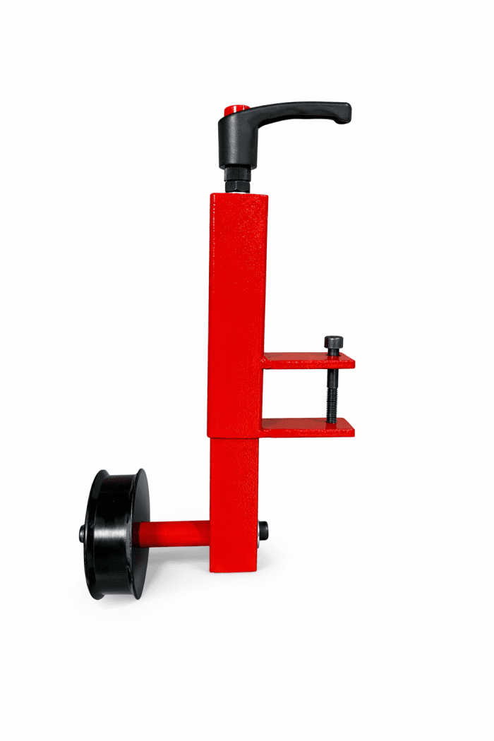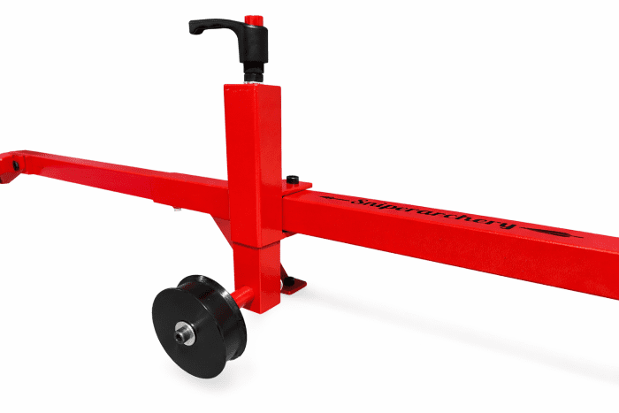 Se instala en el cuerpo de la prensa a la altura del centro del cuerpo del arco, primero meteremos el rodillo hacia la parte de la prensa para tener espacio para introducir el arco por la parte inferior de la prensa, una vez colocado el arco en la gárras standard sin ejercer presión sobre las palas, sacamos el rodillo haciendo coincidir el rodillo con el centro del arco y con la manivela del accesorio haremos que el rodillo toque ligeramente el cuerpo del arco y ahora ya podemos comprimir las palas del arco con la prensa,