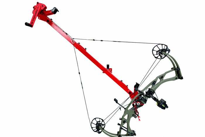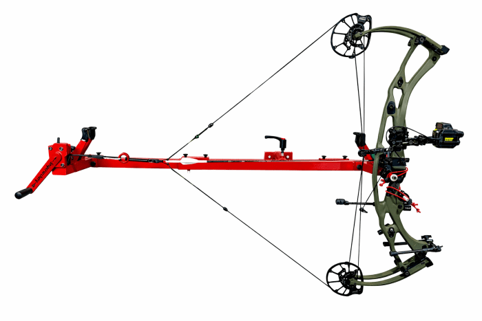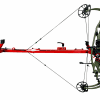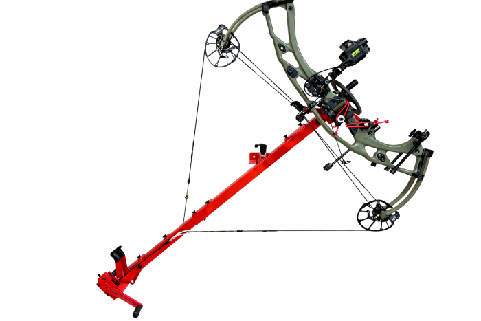 Girando la maquina en posición vertical tendremos un soporte para nuestro arco con el cual podemos realizar varios ajustes cómodamente, como localización del punto de enfleche, ajuste de reposa flechas, ajustes de visor, etc.